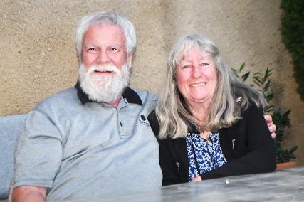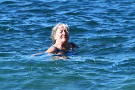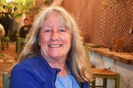 - Gayle pushing / pulling Norm around the harbour of Kastellorizo, especially over the flagstones