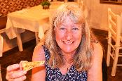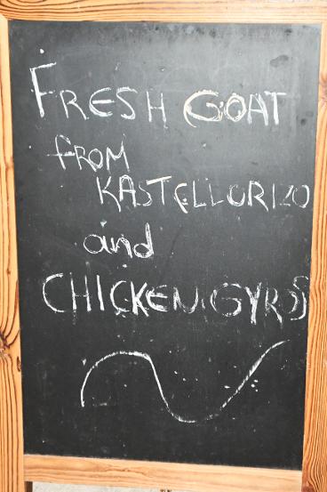 For dinner we chose a nice little taverna - Stenaki - tucked into an alley. During the meal we ended up chatting with an Italian couple from Florence while sipping our wine. We once again started with pita bread, which has been very common here in the Dodecanese. Gayle then had a Greek Salad while I a nice plate of lamb chops. As we just sat enjoying our last night here on Kastellorizo, Michalis, the owner, brought us our 'gift' - another 1/4 litre of wine. Perfect!