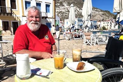 - enjoying drinks, a spinach pie and cookies on a cafe's waterfront waiting for the ferry in Leros